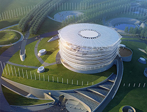 日照市科技館該項目西鄰青島路、東臨綠舟路、南鄰日照植物園,建筑高度34米,建筑面積1.8萬平方米,概算投資2億元??萍拣^設計中引入"黑洞"和"星空"的概念,作為"黑洞"的中心,所有的場地景觀及道路都圍繞這個中心沿螺旋狀放射形布置,暗示了整個場地的"力的源泉"都來自于科技館。